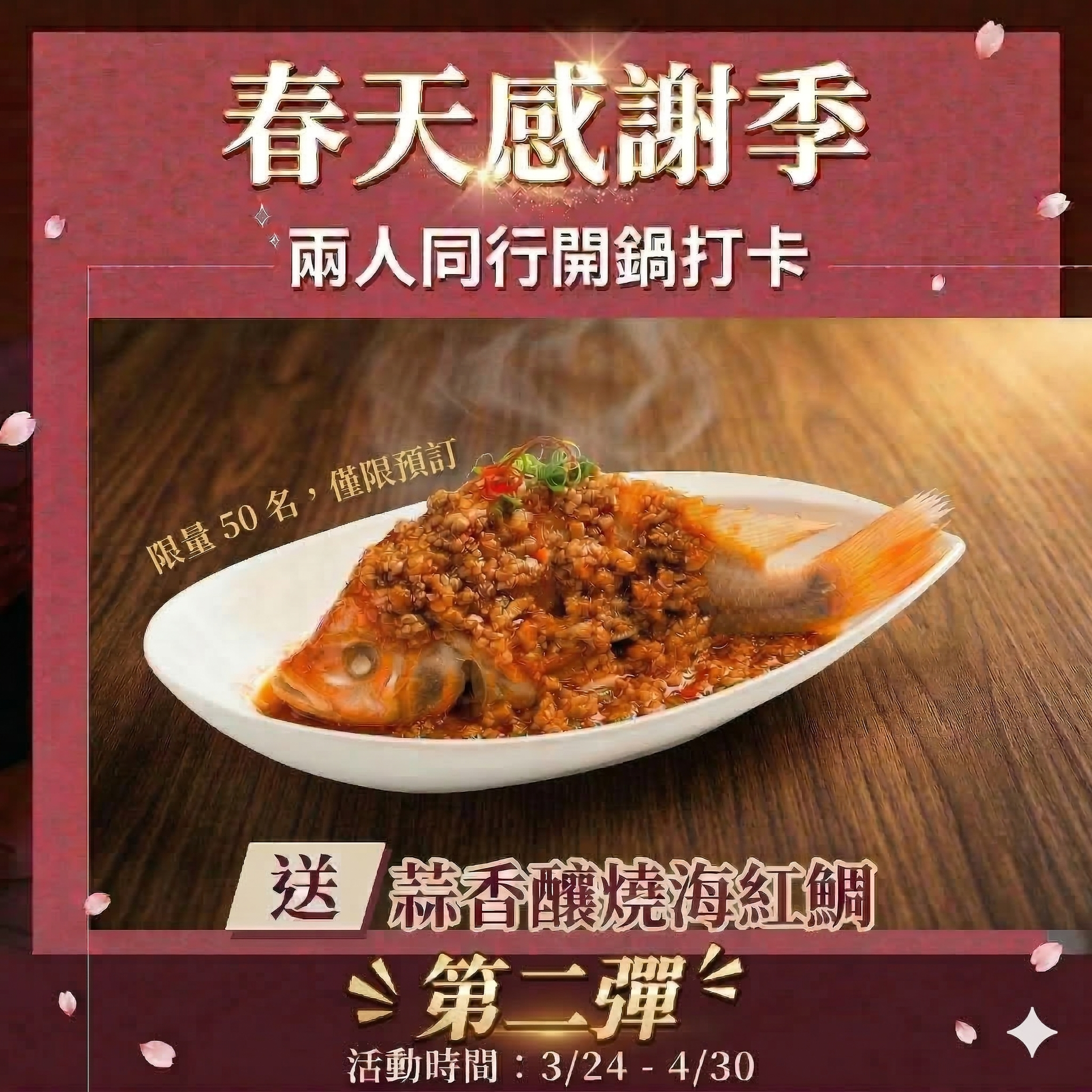 即日起兩人同行開鍋打卡「我要飽著瘦」即招待蒜香釀燒海紅鯛(價值 $699)